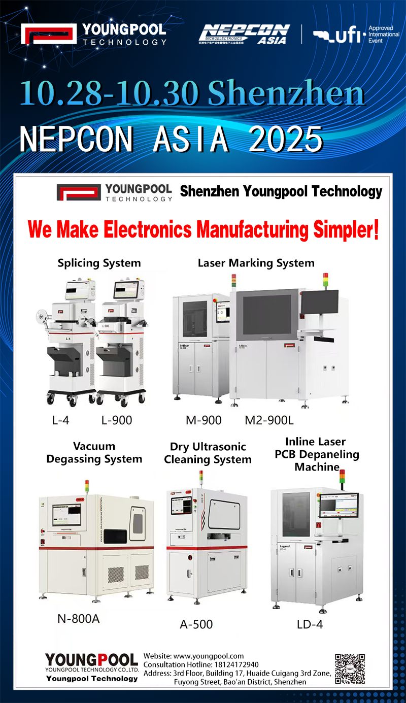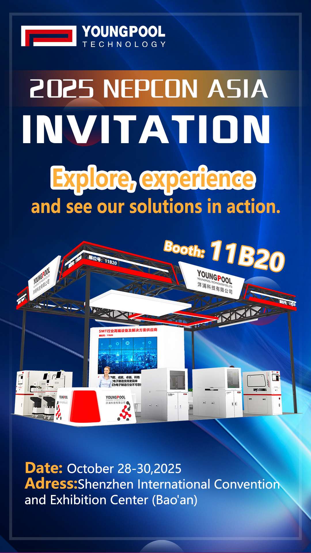 As the electronics manufacturing industry continues to advance toward greater intelligence and precision, NEPCON ASIA, one of the most influential professional exhibitions in Asia, remains a vital platform for industry professionals to gain insights, exchange ideas, and foster collaboration.From October 28–30, 2025, NEPCON ASIA will be grandly held at the Shenzhen World Exhibition & Convention Center (Bao’an). As a trusted equipment and solutions provider with 20 years of deep expertise in the SMT industry, Youngpool Technology will showcase a wide range of innovative, self-developed equipment, joining hands with industry peers to explore the future of electronic manufacturing.