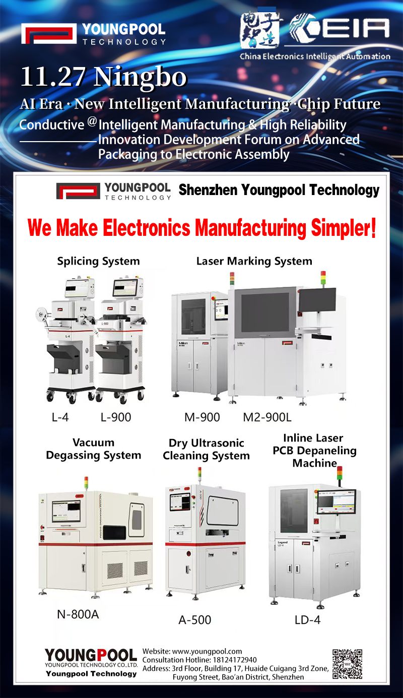 On November 27, the CEIA Conductive @ Intelligent Manufacturing & High Reliability—Innovation from Advanced Packaging to Electronic Assembly Forum (Ningbo Session) will officially kick off. As an invited participating enterprise, Youngpool Technology will showcase multiple intelligent equipment solutions tailored for key SMT processes. Together with industry experts, engineering teams, and partners, we will explore the “intelligent breakthroughs” and “continuous upgrades” of electronics manufacturing in the AI era.We sincerely invite you to join us on-site to witness industry trends and discuss the future of intelligent manufacturing!