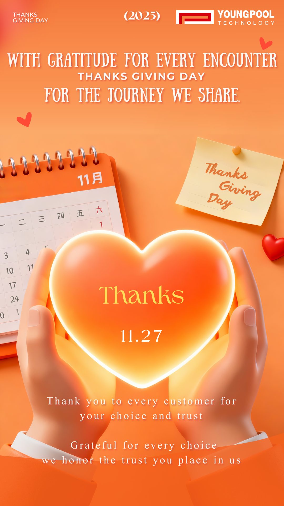 Il 27 novembre 2025, celebriamo il caloroso Giorno del Ringraziamento, che coincide anche con la giornata di scambio del CEIA Ningbo Forum. In questo giorno speciale, Youngpool Technology vi ringrazia sinceramente per averci accompagnato lungo tutto il cammino.
